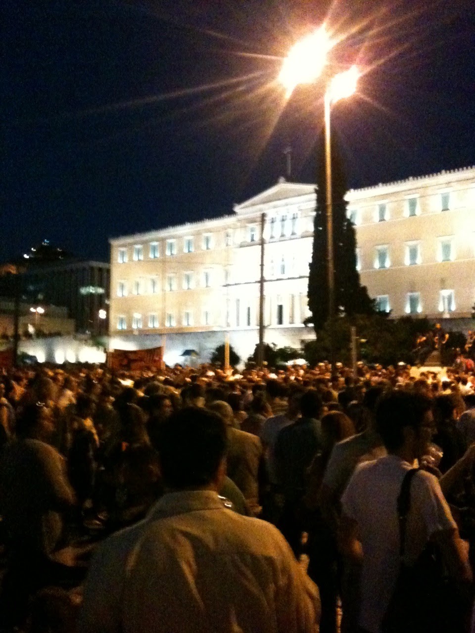 Να παρατηρήσω μόνο κάπου εδώ, πως είδα παιδάκια (μωρά) να κυνηγιούνται ανάμεσα στα ΜΑΤ (έπρεπε να έχω βγάλει φωτογραφία), είδα μαμάδες και μπαμπάδες με καρότσια, έναν παπά, είδα παππούδες και γιαγιάδες να κάνουν βόλτες στην κατάμεστη πλατεία, χαμένους τουρίστες να κοιτούν αποσβολωμένοι, σκυλιά με λουριά, ζευγάρια που φιλιόντουσαν. Ένιωσα λίγη χαρά μεταξύ μας, λίγη αισιόδοξία, λίγη ελευθερία.